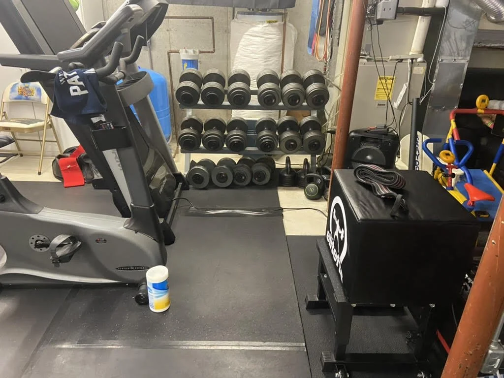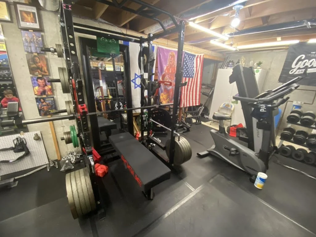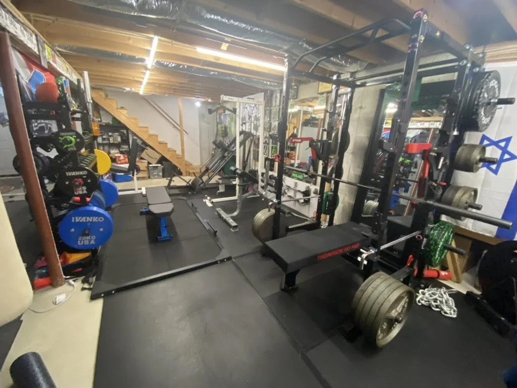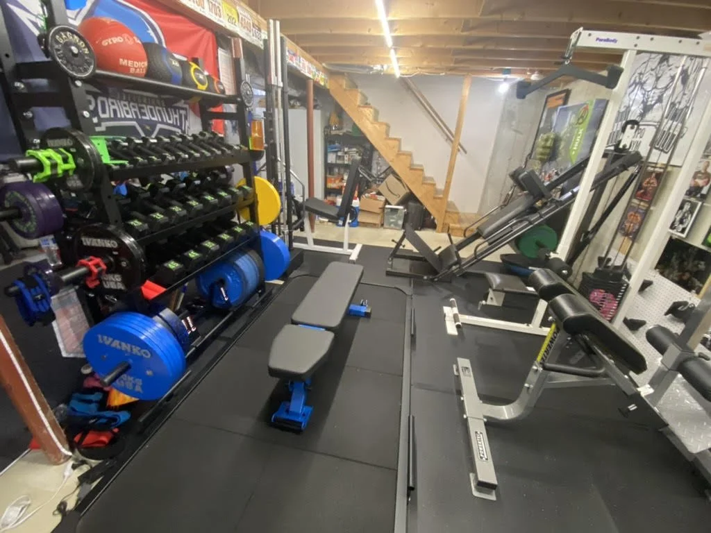 Jason of Westfield, Massachusetts, has owned a basement gym for 6 years. The weekend Jason’s wife told him she was pregnant, he began a home gym. He competes in powerlifting, and a home gym seemed like a good way compliment his gym membership and do some speed work at home. What began as a simple setup with a rack, barbell, deadlift platform, and Bowflex 1090s, quickly “took on a real life of its own.” He hasn’t had a gym membership for 5.5 years now. Jason goes by BasementGymDad on Instagram and YouTube.